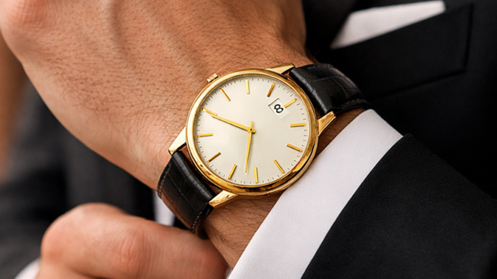 1. Classic Gold Dress Watch – Timeless Wedding Elegance